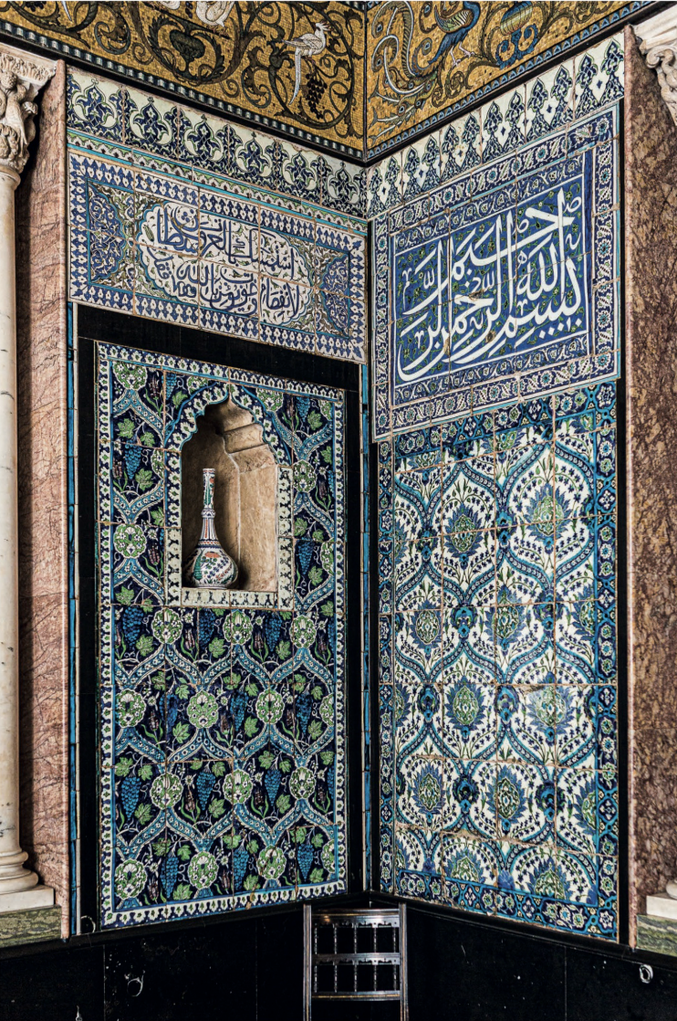 A second panel of six tiles was attached to a section of wall under the stairs and, like the larger panels, is visible in an engraving accompanying a brief article on artists’ studios published in the December 1876 issue of Building News. This panel is decorated with the bismillah, the opening phrase of each chapter of the Quran, in a very elegant script on a dark blue ground (Fig. 4). The floral scrolls behind the writing are painted in a vivid green with touches of purple and black, a colour combination associated with Damascus, although there is no way to establish whether Leighton acquired the panel on his 1873 trip to that city, during his 1867 trip, which included Rhodes and Istanbul, or on his 1868 trip to Cairo. By the mid-1870s historical artworks from across the Middle East were being widely traded within the region, and the location in which a piece was acquired is not a secure indication of its origin.