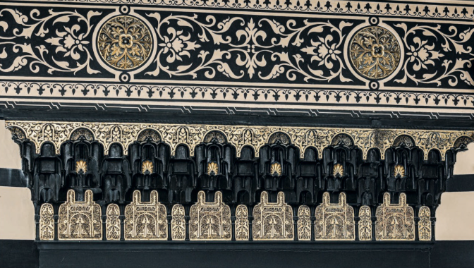Centred on the apex of each of these niches is a wood panel painted black and heavily decorated with gold (Fig. 7, see also Fig. 6). The colour scheme matches the woodwork of the rest of the house, but the design of projecting stalactites framed by panels of inscription is taken from the decoration of the Alhambra (Fig. 8). This complex of Nasrid dynasty (1238–1492 [in Granada]) palaces in Granada dating to the 14th century was much admired in the 19th century largely due to the publication of the two-volume work Plans, Elevations, Sections, and Details of the Alhambra, illustrated with details of the decoration of the buildings in colour (Goury and Jones, 1842 and 1845). The books were produced by the architect Owen Jones (1809–74), with the mapping and recording of the buildings accomplished jointly with architect Jules Goury (1803–34), who died in a cholera epidemic during the work.