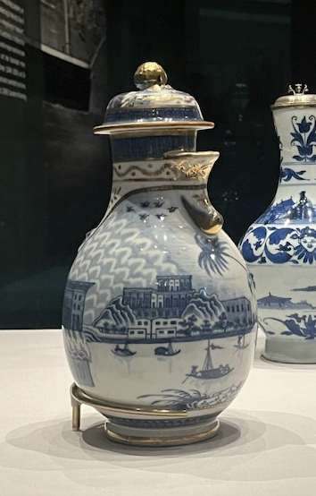 At first glance, the artefact, with a European pear-shaped body and a pictorial design of Calcutta, manifests ‘Chineseness’ solely through its translucent materiality and blue-and-white palette. From the 1720s, as Chinese porcelains became more readily accessible in Britain, their decorative styles minimized overt visual designs indicating ‘Chineseness’. Material origin and iconic colour schemes alone sufficed to suggest an exotic allure and signify elite status, allowing European consumers greater freedom in selecting both forms and motifs. By the 1780s, as David Howard observed, ‘anyone could order a service with personal initials and a pseudo-crest of two birds to indicate marital bliss or an anchor to remind a sailor of his years at sea’ (1994, p. 17). The coffee pot exemplifies the appeal of Chinese export porcelain in the 18th century, which rested in its adaptability as a versatile medium that could hybridize and cater to local tastes globally (Porter, 2002, p. 399).