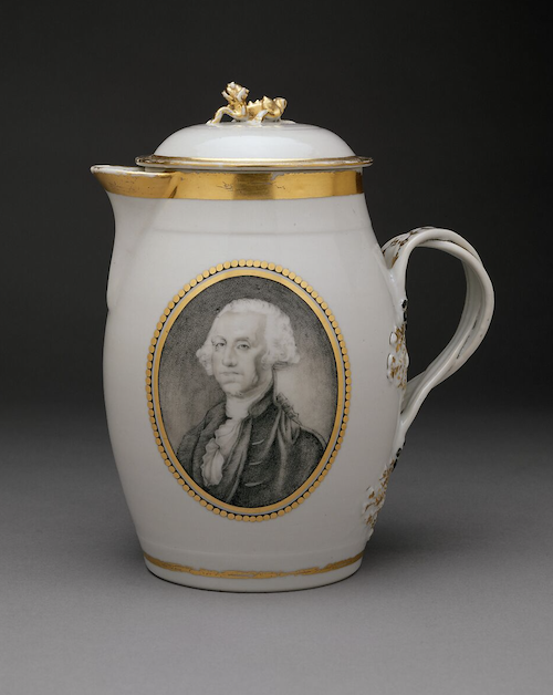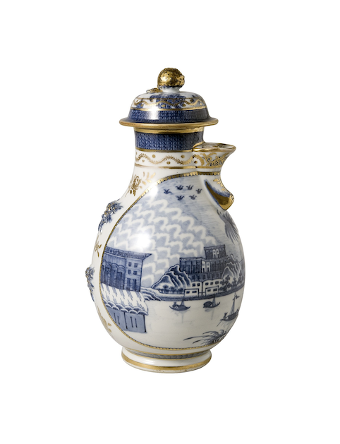 The year 1757 witnessed not only the victory of the British East India Company (EIC) at the Battle of Plassey and the subsequent conquest of Calcutta, but also the establishment of Canton as the sole legal port of the Qing dynasty (1644–1911) open to official trade with the West, under the ‘single port commerce system’ of the Qianlong emperor (r. 1736–95). Decades later, a gilded porcelain coffee pot with an underglaze-blue design of the Calcutta waterfront (fig. 1) exemplifies the convergence of these two events, intertwining the narratives of the EIC, Calcutta, and Canton (Guangzhou). Made in China around 1790 for the English export market, the ‘coffee pot with a view of the Calcutta waterfront’ (hereafter, the coffee pot) acts as a ‘contact zone’ where cultures of Britain, China, and India ‘meet, clash, and grapple with each other’ through transnational circulation, manufacture, and trade (Pratt, 2008, pp. 8–9). Although the original patron remains undocumented, the piece was likely commissioned by an EIC member who either resided in or maintained connections with Calcutta.