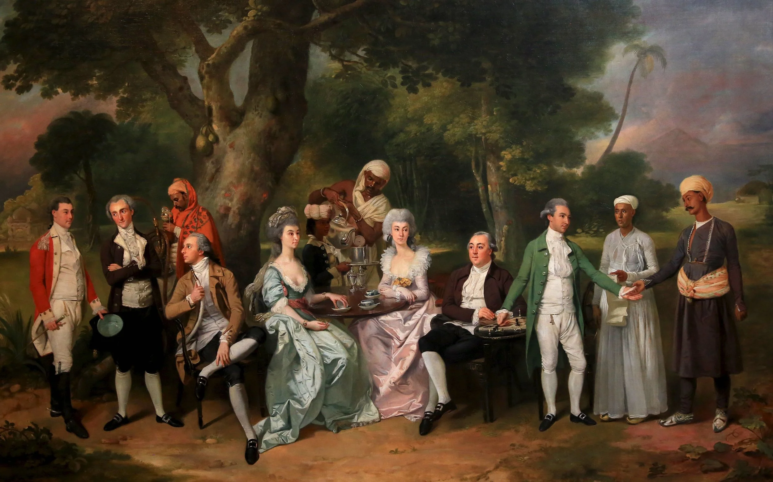 However, while seeking to maintain ties to the perceived stability of Britishness in the homeland, Britons in Calcutta were also questioning what constituted a distinctly British identity in an environment where Indians selectively assimilated European elements and Europeans, in turn, judiciously adopted Indian ones. This negotiation of identity is reflected in works such as the late 18th century oil painting The Auriol and Dashwood Families (fig. 12), by Johann Zoffany (1733–1810). In this portrait, trans-Asian commodities including Chinese porcelain, Chippendale chairs, and Asian silk garments styled after current European fashions circulate around the bodies, acting as projections and constructions of British belonging, linking the Anglo-Indian elites both to the imperial centre and to their embodied presence in a hybrid environment. Similarly, the coffee pot, as a pictorially and structurally hybridized object guided not by ‘purity and integrity’ but by ‘thorough-going mongrelization’ (Porter, 2002, pp. 403–4), not only constructed part of the commissioner’s British identity by incorporating elements familiar in the metropole, but also situated the commissioner within a multicultural nexus.