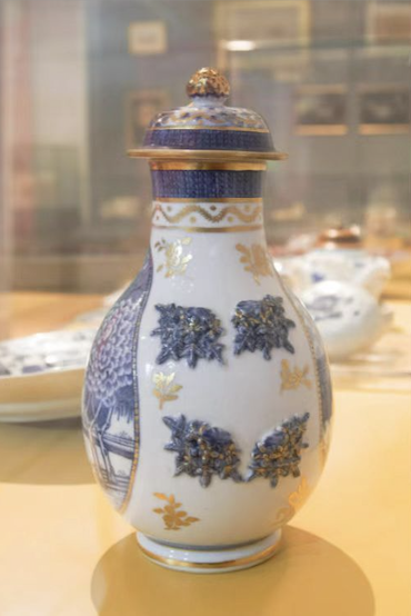 Yet the passage of time left the piece incomplete. Minor irregularities on the back at the connection points of its symmetrical applique leaf decorations suggest the loss of its original handles, denoting that its functionality as tableware diminished at some point after production (fig. 2). The four-corner leaf motifs imply that the handles were likely crafted in a twisted, crossed strap form, similar to those on a toddy jug made in China between 1800 and 1820 for the American market (fig. 3). Given the absence of its handles, curators at the Hong Kong Palace Museum have displayed the porcelain with its back against the wall (fig. 4), drawing viewers’ attention to its underglaze-blue pictorial narrative of the bustling Calcutta waterfront.
