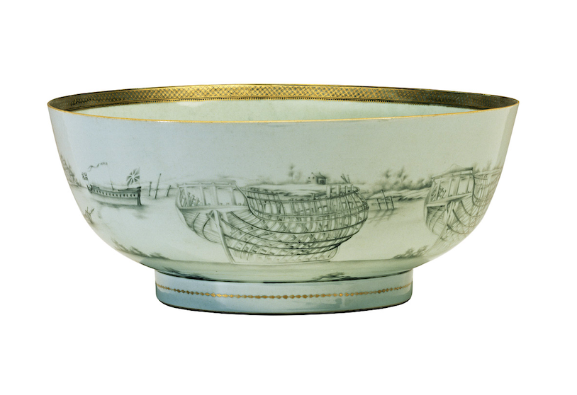 This blending of elements across regions reflects a broader practice among Jingdezhen porcelain painters, who often combined imported imagery with local decorative motifs to create cross-cultural designs. A Chinese export punch bowl made around 1785 for the Barnard family of shipbuilders demonstrates this practice (fig. 10). It displays a grisaille design of the skeletal structure of a half-built ship, likely copied from a 1768 engraving in Architectura Navalis Mercantoria by Fredrik Henrik af Chapman (1721–1808) (fig. 11). While the designers followed European conventions in depicting the hull, the hut with sloped roofs and brush-style greenery in the background evoke a rustic Chinese landscape.