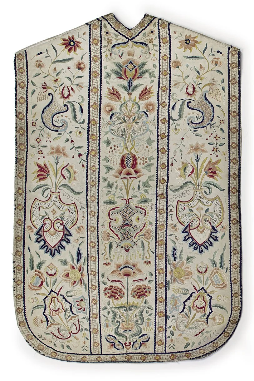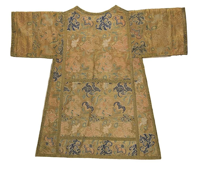 A set of vestments from the now-extinct Convento do Deasagravo, in Lisbon, currently held in the Museu Nacional de Arte Antiga (Inv. 1208-1216), features different subjects. The set comprises two dalmatics, a chasuble, two stoles, three maniples, and a cope, all decorated with flowers, musical instruments, bats, and the eight auspicious symbols of Buddhism. Such a motif might be surprising in a Catholic context. However, in practice, what mattered more than the theological content—about which the majority of the population was unaware— was the artefacts’ beauty and the fact that they came from the mythical China, which had been part of the Western imagination since ancient times. Moreover, in the same manner that the Church of Rome often repurposed fabrics that were originally produced for secular ends, such as furnishings or apparel, it also integrated non-European textiles into the creation of liturgical vestments.