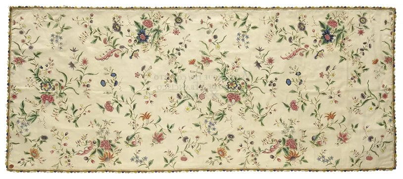 Satin embroidered with silk and gold-wrapped paper thread; 132 x 283 cm